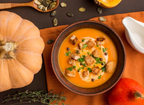 PrimaMedia, 15 октября 2023. Осень — это время года, когда наш организм особенно нуждается в поддержке. Чтобы избежать авитаминоза и укрепить иммунитет, предлагаем приготовить насыщенный и полезный тыквенный суп-пюре. Имбирь добавит ему пикантности и усилит противовоспалительное действие, а орехи насытят организм полезными жирными кислотами.