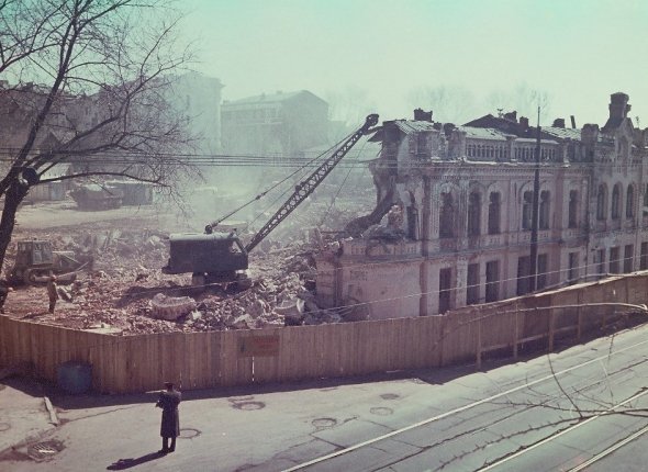На фотографии зафиксирован момент сноса здания по адресу ул. Семеновская, 15. Кадр отображает процесс демонтажа величественного здания в один из солнечных дней.