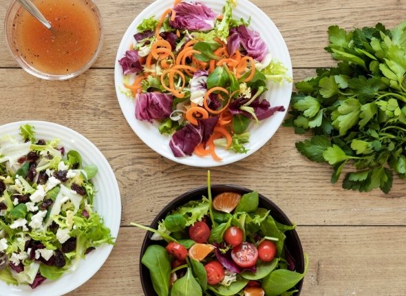 - Смешайте оливковое масло и яблочный уксус. Полейте овощи заправкой и слегка подсолите.