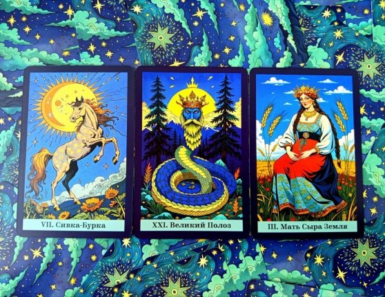 2. Великий Полоз (Мир). Образ змея или полоза в народной мифологии часто символизирует мудрость, трансформацию и вечность. Эта карта соответствует аркану Мир, завершающему мажорный аркан Таро. Она говорит о завершении цикла, гармонии и достижении внутреннего единства.