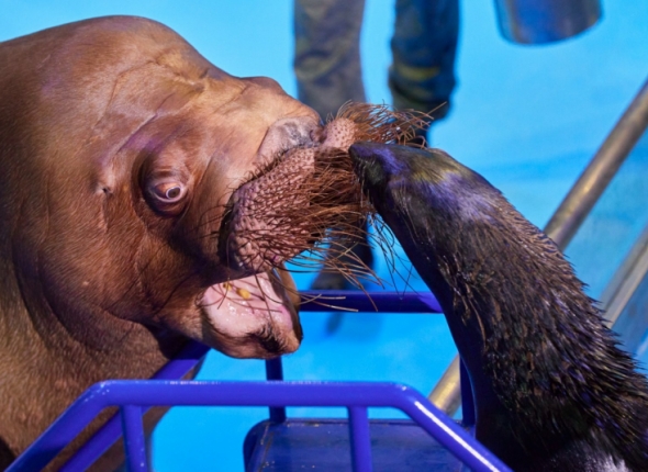 Как отметил старший тренер Владимир Маслов, в природе моржи чаще встречаются лишь с хищниками — белыми медведями и касатками — и стараются их избегать. Обычно они держатся своими группами, моржами, поэтому не пересекаются ни с дельфинами, ни с белухами, ни с морскими котиками: у них просто нет среды, где они могли бы познакомиться. Именно поэтому в океанариуме, где Мише необходимо общение, для него периодически устраивают такие своеобразные "тусовки".