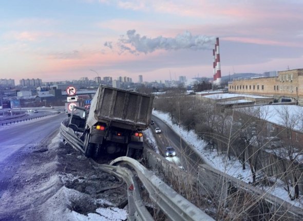 "Водитель большегруза не справился с управлением транспортного средства и совершил наезд на леерное ограждение. В результате дорожного-транспортного происшествия никто не пострадал", — говорится в сообщении.