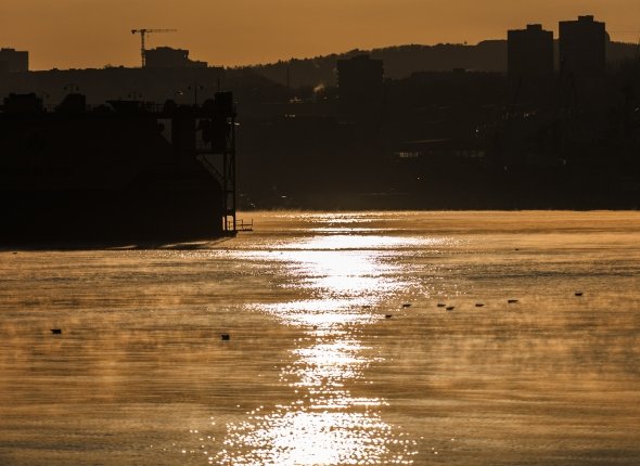 PrimaMedia, 4 декабря. Жители Владивостока стали свидетелями необычного зрелища утром 4 декабря — акватория бухты Золотой Рог была окутана густым паром, создавая впечатление, будто вода "кипит".