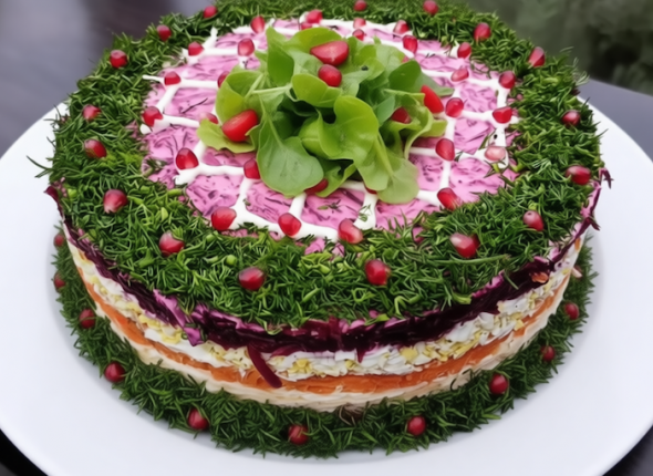 - Верх салата оформите майонезной сеткой, украсьте мелко нарезанным укропом и зернами граната.
