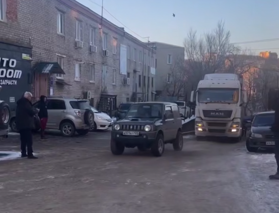 PrimaMedia, 25 декабря. Во Владивостоке водитель Suzuki Jimny спас фуру из ледяного плена. На одном из скользких подъемов водитель большегруза не смог подняться и оказался в ловушке.