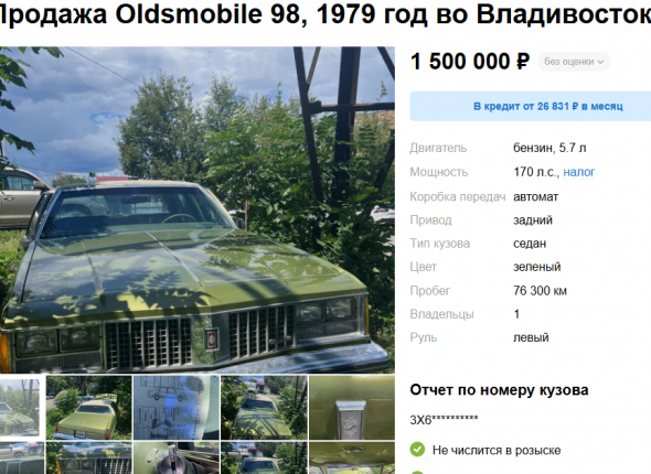 PrimaMedia, 19 января. Oldsmobile 98 Regency Sedan выставили на продажу во Владивостоке за 1,5 млн рублей. На соответствующее объявление случайно наткнулся корр. ИА PrimaMedia. Речь идёт о полноразмерном американском автомобиле 1979 года с мощностью 170 лошадиных сил и заявленным пробегом в 76 300 км.