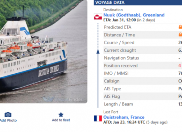 Согласно данным портала Vesselfinder (12+), судно отправилось в Арктику из Франции в прошлую пятницу, 23 января, и прибудет в Нуук (столица Гренландии) 31 января. В начале февраля оно станет местом комфортного размещения для датских и других иностранных солдат.