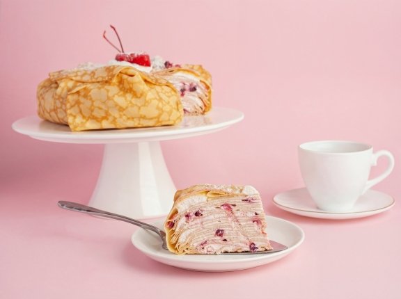 Представьте: тонкие блинчики, слой за слоем пропитанные воздушным сметанным кремом и сочной брусникой. Этот торт — дань традиции: он берёт лучшее от домашних блинов со сметаной и превращает в праздничное угощение, созданное специально для Масленицы.