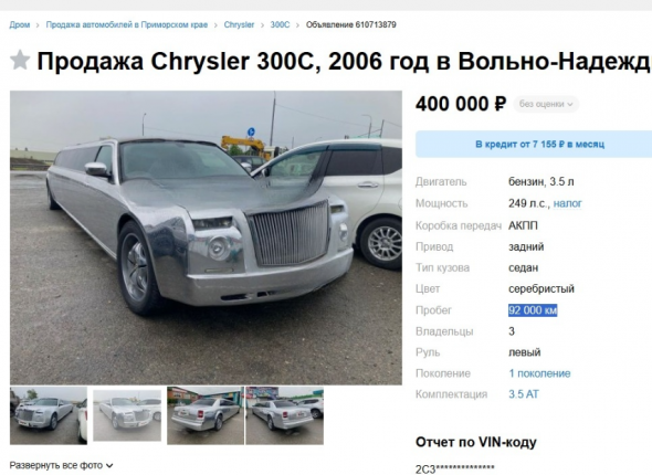Лимузин Chrysler 300C, переделанный под Rolls‑Royce, выставили на продажу в селе Вольно-Надеждинское за 400 тысяч рублей. На соответствующее объявление наткнулся корреспондент ИА PrimaMedia.