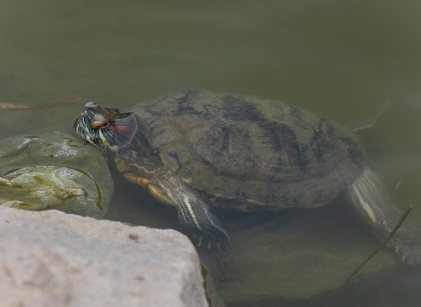 Издалека показалось, что никаких черепашек мы не встретим, но решили попытать удачу и пройтись вокруг. И не зря. Около берега водоема у одного "балкона" сидела небольшая черепашка — она подошла ближе и высунула голову из воды, чтобы подышать воздухом.