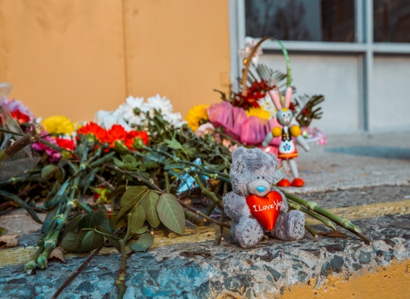 В память об убитой у ее школы – цветы, свечи и игрушки