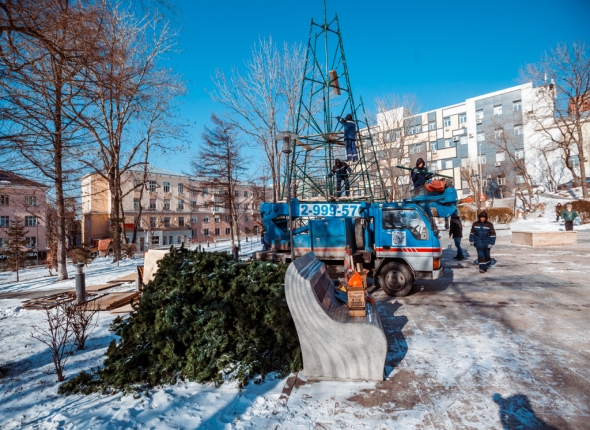 Первую елку устанавливают во Владивостоке. Фото: Фото: Мария Бородина, РИА PrimaMedia