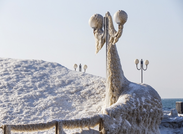 PrimaMedia, 30 ноября 2015. Кадры из фильма "Послезавтра" запечатлел фотограф РИА PrimaMedia Александр Хитров на прибрежных акваториях Владивостока. Кудесница природа постаралась удивить жителей столицы Приморья необычайной красоты ледяными скульптурами. Фонари, пирсы, ограждения и берега – все как в известном фильме.