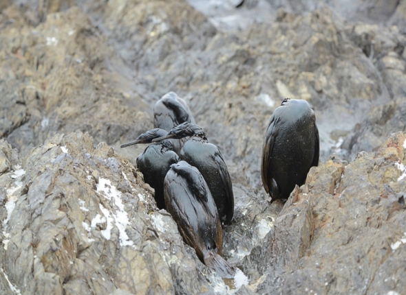 "Однако на брекватере и прилегающих скалах экологи обнаружили множество беринговых бакланов, практически полностью покрытых мазутом. Не менее 100 птиц были еще живы, но склеенные перья не давали им возможности летать и даже плавать. Бакланы пытались спрятаться от сильного северо-западного ветра за уступами скал и бетонных конструкций, не менее пяти птиц уже погибло. В ситуации сильного ветра и минусовой температуры шансы выжить у остальных очень небольшие. Брекватер, прилегающие к нему море и скалы обильно покрыты пятнами мазута и толстой пленкой нефтепродуктов. Накануне в этом месте было отмечено лишь несколько загрязненных птиц, но за сутки их число выросло в десятки раз", — рассказали представители "Клуба Бумеранг" и "Экологической вахты Сахалина".