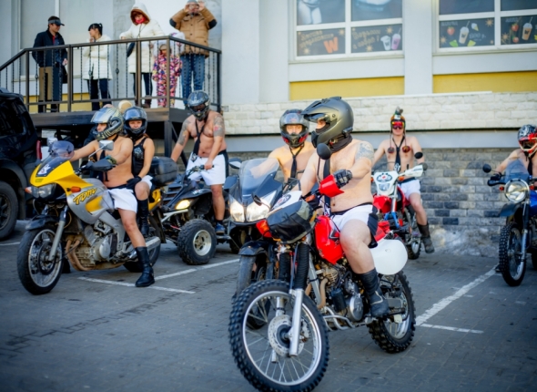 PrimaMedia, 12 декабря 2015. Байкеры в нижнем белье уже в пятый раз провели акцию "Мотомудозвоны", проехав по улицам Владивостока. Минусовой температуры не испугались и приняли участие в акции около десятка человек на своих железных конях. Маршрут байкеров занял всего 15 минут от Wisky bar на Семеновской до фуникулера, сообщает РИА PrimaMedia.