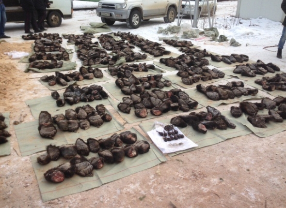 "На территории предприятия по обработке лесоматериалов в железнодорожных вагонах полицейские обнаружили 37 мешков с опилками, в которых находились медвежьи лапы. В ходе проведенного осмотра сотрудники полиции изъяли 527 медвежьих лап, медвежий пятак, 11 желчных пузырей медведя, три струи кабарги", – говорится в сообщении.