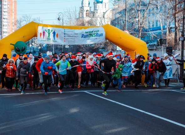 PrimaMedia, 1 января 2016. Жираф, викинг, индеец, байкеры, Снегурочка, Деды Морозы вместе с сотней горожан пробежали сегодня, 1 января, по Океанскому проспекту во Владивостоке. Маршрут "Забега по-домашнему" прошел от остановки "Прапорщика Комарова" до центральной площади. Первые добравшиеся до финиша получили символические подарки, сообщает РИА PrimaMedia.