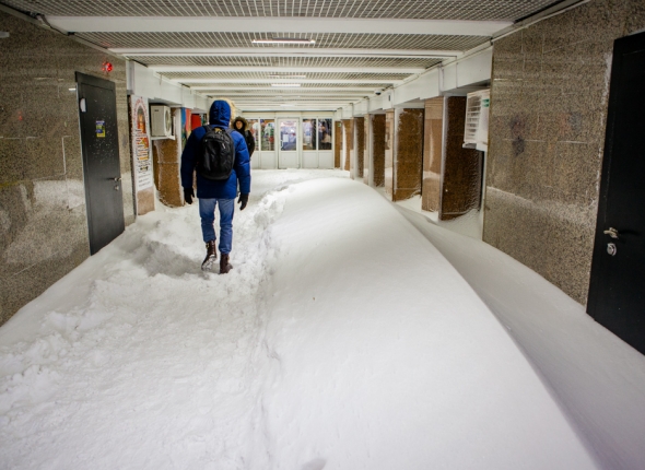 PrimaMedia, 19 января 2016. Во время метели, которая бушует во Владивостоке со вчерашнего дня, снегом засыпало даже подземные переходы. Заметно, что накануне лестницы чистили, но с утра вновь были засыпаны не только ступеньки, но и сам проход под улицей, сообщает РИА PrimaMedia.