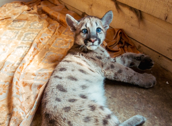 Маленькому горному льву четвертый месяц, и пока он живет дома у хозяев зоопарка "Чудесный". В будущем планируется, что маленький горный лев некоторое время будет жить с африканским львом Аристо.
