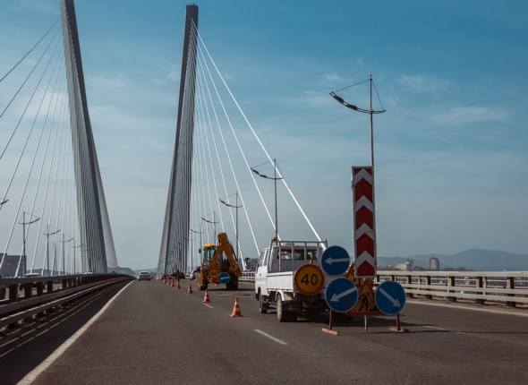 PrimaMedia, 21 апреля 2016. Дорожники снова латают ямы в асфальтовом покрытии Золотого моста во Владивостоке. Пресловутую среднюю полосу в направлении Русского острова перекрыли для уж и не вспомнить какого по счету ремонта утром 21 апреля. Но на этот раз за работу взялся новый подрядчик – АО "Специализированное строительное управление", сменившее на этом посту находящуюся в состоянии банкротства "ТМК". Администрация Приморского края заключила долгосрочный контракт на содержание вантового и низководного мостов на два года за сумму в почти 800 млн рублей, сообщает РИА PrimaMedia.