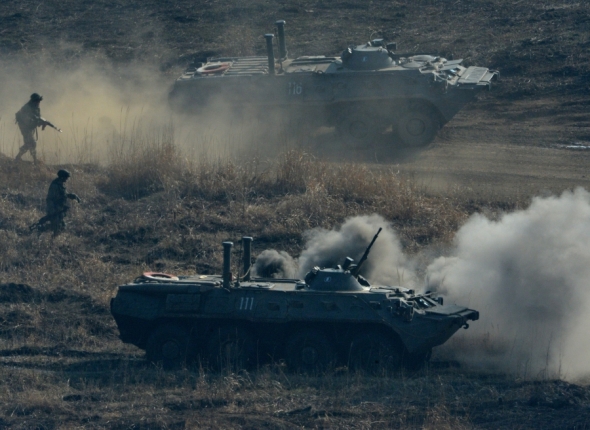 PrimaMedia, 22 апреля 2016. Масштабные межвидовые учения нескольких соединений 5-й общевойсковой армии ВВО прошли 21 апреля на тактическом поле "Клерк" Бамбуровского военного полигона в Хасанском районе Приморского края, сообщает РИА PrimaMedia. В учениях приняли участие подводные и надводные корабли, морская авиация, береговые войска, подразделение специального назначения и бригада морской пехоты из состава сил Тихоокеанского флота, армейская, фронтовая и разведывательная авиация 11-й армии ВВС и ПВО ВВО, мотострелковые, танковые и артиллерийские подразделения 5-й общевойсковой армии ВВО. Вся эта военная армада четко и строго отработала несколько сложных боевых задач, за которыми с командного пункта наблюдал командующий Восточный военным округом генерал-полковник Сергей Суровикин. Как прошли учения – в репортаже нашего военного обозревателя Алексея Суконкина.
