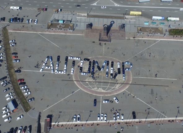 На площади были выстроены надписи из автомобилей "АВТОСАЛОН-2016", "АВТОМИР", "ДВИЖЕНИЕ", "МИНУТА", "АСК". Процесс составления слов фиксировали видеооператоры, профессиональные фотографы и несколько квадрокоптеров.