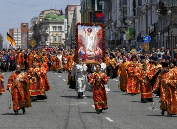 PrimaMedia, 8 мая 2016. Городским крестным ходом завершили Светлую пасхальную седмицу православные Владивостока в воскресенье, 8 мая. Шествие верующих началось от Покровского кафедрального собора и завершилось на площади Борцов революции. Как это было — в фоторепортаже РИА PrimaMedia.