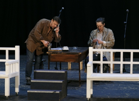 PrimaMedia, 12 мая 2016. Автор фото: Александр Хитров. Спектакль "Заповедные дали" по мотивам повести Сергея Довлатова "Заповедник" поставят на сцене Приморского театра имени М. Горького. Перед майской премьерой актеры провели одну из репетиций на сцене театра, сообщает РИА PrimaMedia.