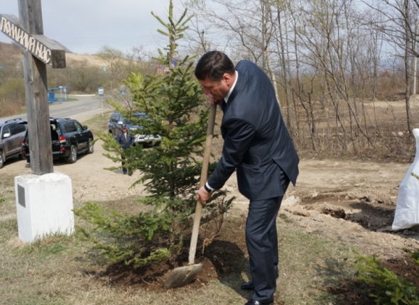 Участие в акции по высадке первой партии саженцев от Славянского СРЗ приняли глава Хасанского муниципального района Сергей Овчинников и глава Славянского городского поселения Константин Ким. Как сказал Сергей Владимирович, в мае акция по озеленению Славянки продолжится, но уже силами администрации Хасанского района.