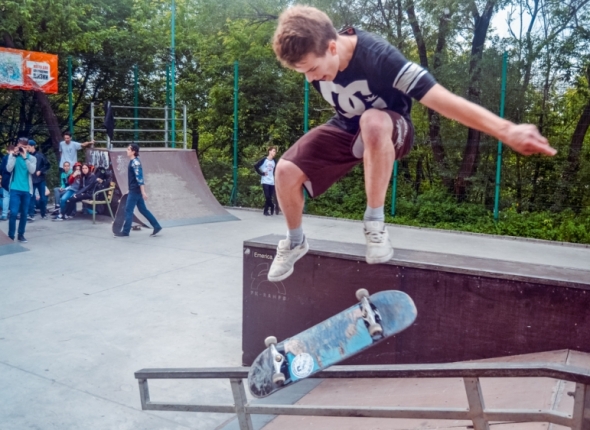 PrimaMedia, 22 июня 2016. Оксана Куличева. Любители экстремальных видов спорта отметили во Владивостоке 21 июня Международный день скейтбординга. Профессионалы и любители обменивались опытом и учились новым трюкам. Перед соревнованиями более 70 скейтбордистов проехали по улицам Владивостока, сообщает РИА PrimaMedia.