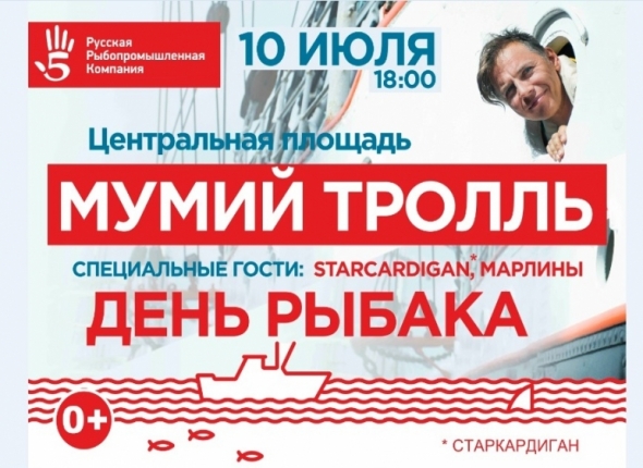 "Гвоздем" празднования в Приморье Дня Рыбака 10 июля станет совместное поздравление "Русской Рыбопромышленной Компании" и группы "Мумий Тролль". В 18.00 часов на центральной площади Владивостока начнется концерт (0+), в ходе которого Илья Лагутенко сотоварищи исполнят свои самые летние песни. Кроме того, свои получасовые сэты сыграют известные местные коллективы "Марлины" и Starcardigan, сообщили РИА PrimaMedia организаторы мероприятия.