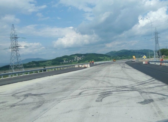 Полностью автодорога еще не готова: автомобили проезжают фактически по стройке. Но уже видно, что дорога будет широкой и, что очень важно, — бетонной. Участок старой автомобильной дороги, которая находится рядом с гипермаркетом "Три кота", уже перекрыт.