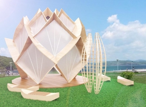 "В результате нашей работы подготовлен эскизный проект выставочного павильона Приморского края в форме лотоса, изготовленного из поликарбоната, дерева и металлических труб. Диаметр цветка – 9,5 метров, высота – 7 метров, площадь – 65 кв. метров", – рассказали в департаменте культуры Приморского края.