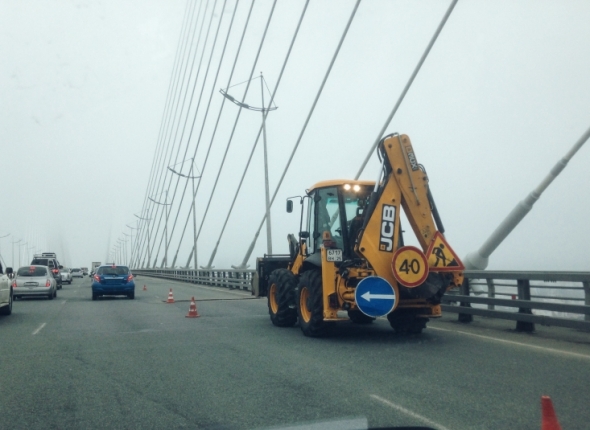 PrimaMedia, 28 июля 2016. Бригаду дорожных рабочих на Золотом мосту во Владивостоке заметили водители сегодня, 28 июля. С момента последнего латания дыр в асфальте моста прошел ровно месяц. Как сообщает корр. РИА PrimaMedia, на этот раз ремонтировать начали правую полосу движения в сторону Чуркина.
