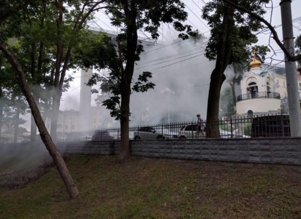 PrimaMedia, 11 августа 2016. Клубы черного дыма на некоторое время окутали улицу Светланскую во Владивостоке в четверг, 11 августа. Как оказалось, из-за двух неизвестных, решивших в парке недалеко от остановки Лазо жечь кабель. После высказанного замечания о нарушении общественного порядка мужчина и женщина ретировались, сообщает РИА PrimaMedia.