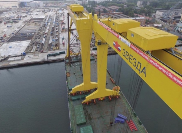 PrimaMedia, 16 августа 2016. Два гигантских крана мощностью 320 тонн доставили и установили на только что построенном тяжелом стапеле на судостроительном заводе "Звезда" в Большом Камне". Заместитель председателя правительства РФ Дмитрий Рогозин поздравил строителей завода "с важной вехой" в своем Twitter, сообщает РИА PrimaMedia.
